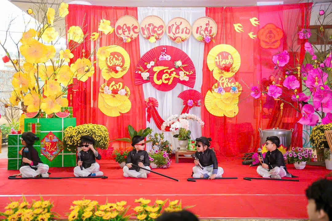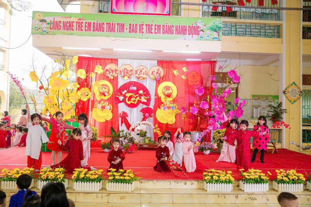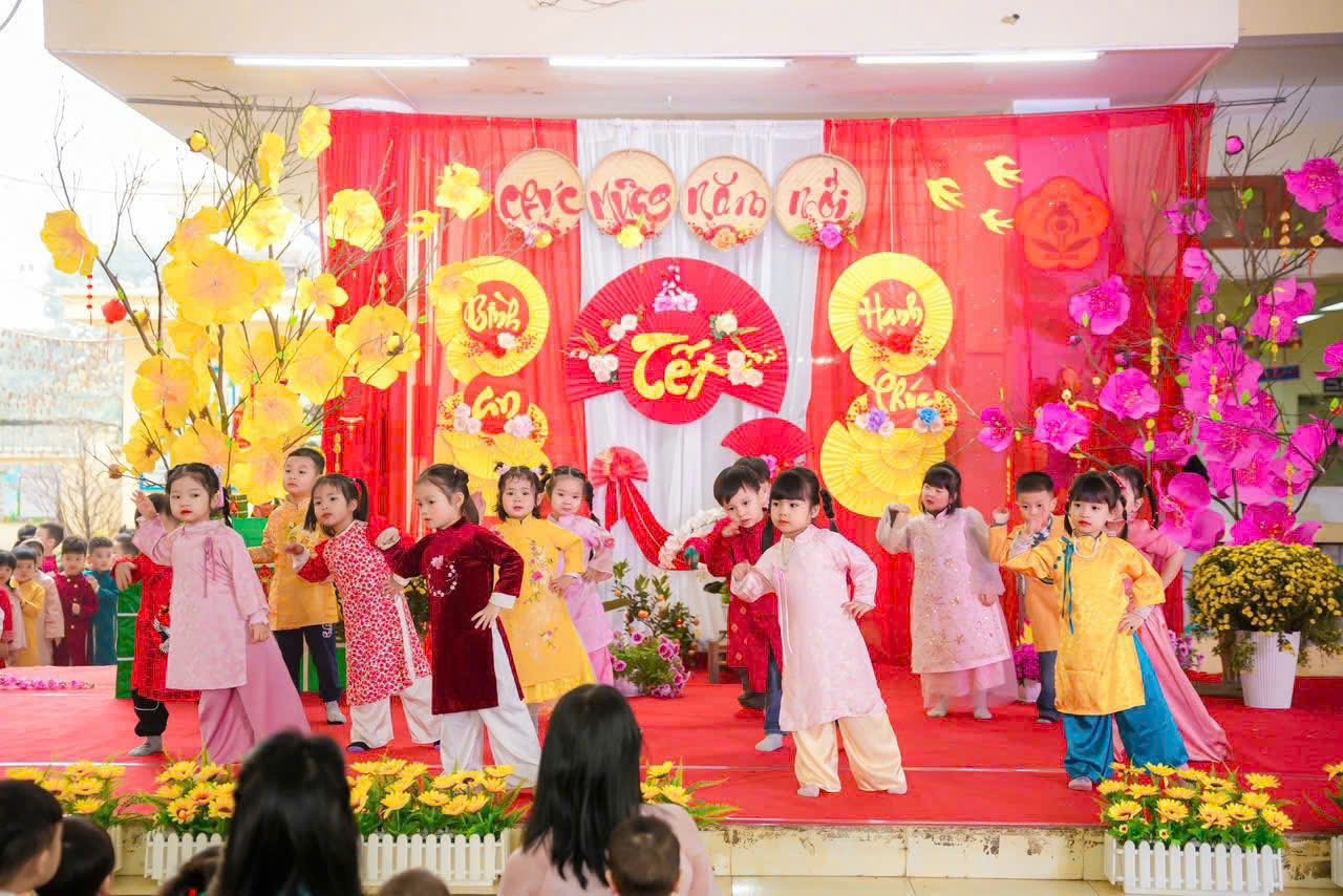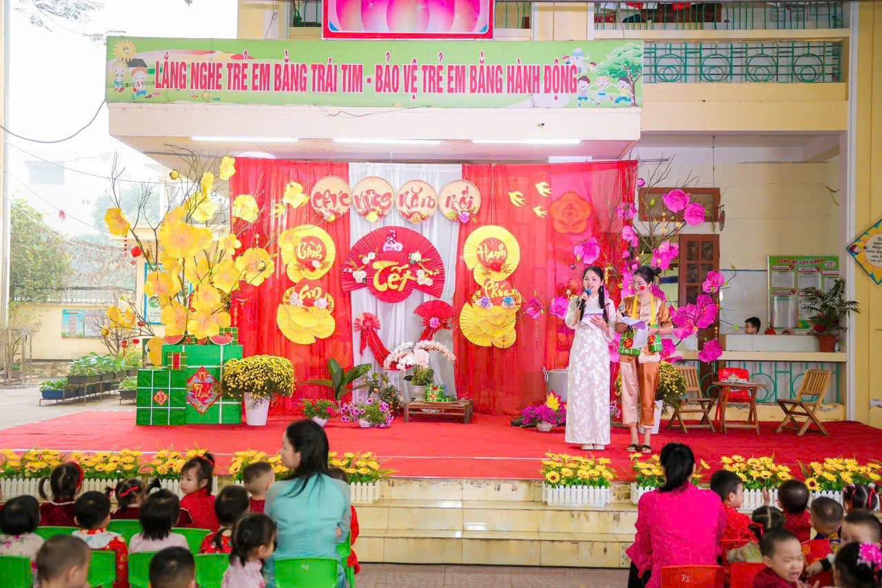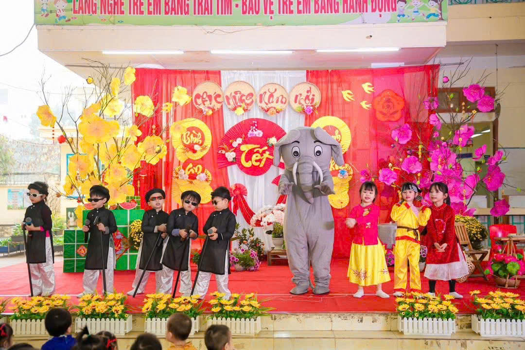 Mở đầu chương trình là các tiết mục văn nghệ do cô và trò nhà trường biểu diễn. Những bài hát, điệu múa vui tươi, rộn ràng sắc xuân đã mang đến không khí ấm áp, tràn đầy niềm vui. Các bé tự tin thể hiện trên sân khấu với những bộ trang phục rực rỡ, đáng yêu, nhận được sự cổ vũ nhiệt tình từ phụ huynh và các cô giáo.