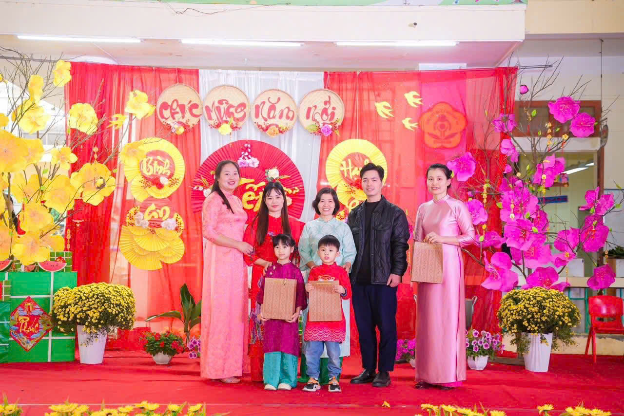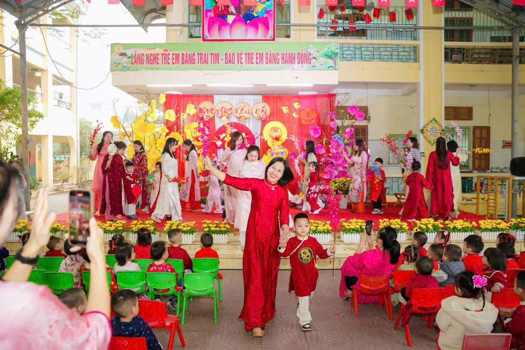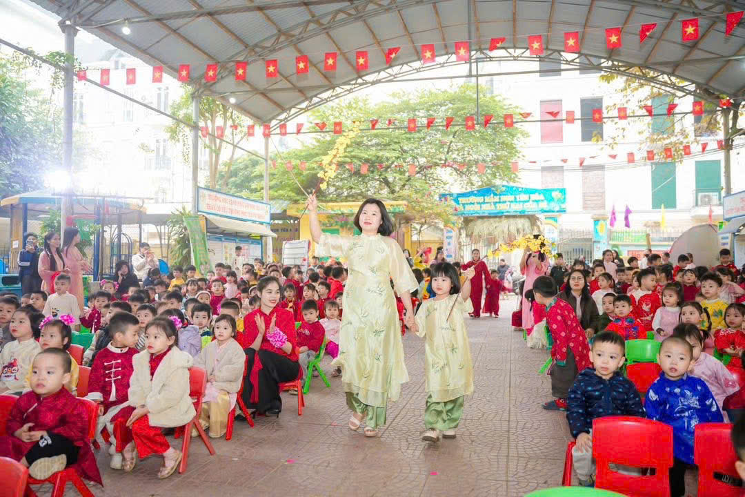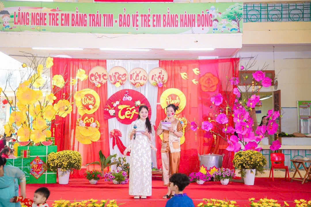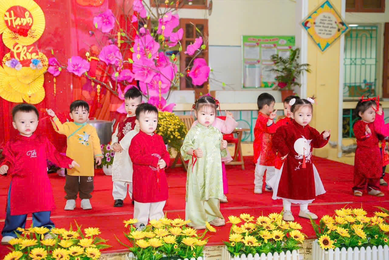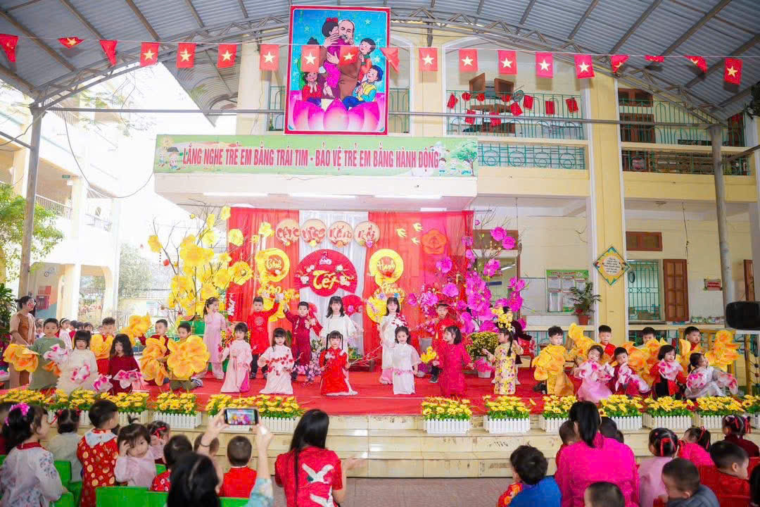 Mở đầu chương trình là các tiết mục văn nghệ do cô và trò nhà trường biểu diễn. Những bài hát, điệu múa vui tươi, rộn ràng sắc xuân đã mang đến không khí ấm áp, tràn đầy niềm vui. Các bé tự tin thể hiện trên sân khấu với những bộ trang phục rực rỡ, đáng yêu, nhận được sự cổ vũ nhiệt tình từ phụ huynh và các cô giáo.