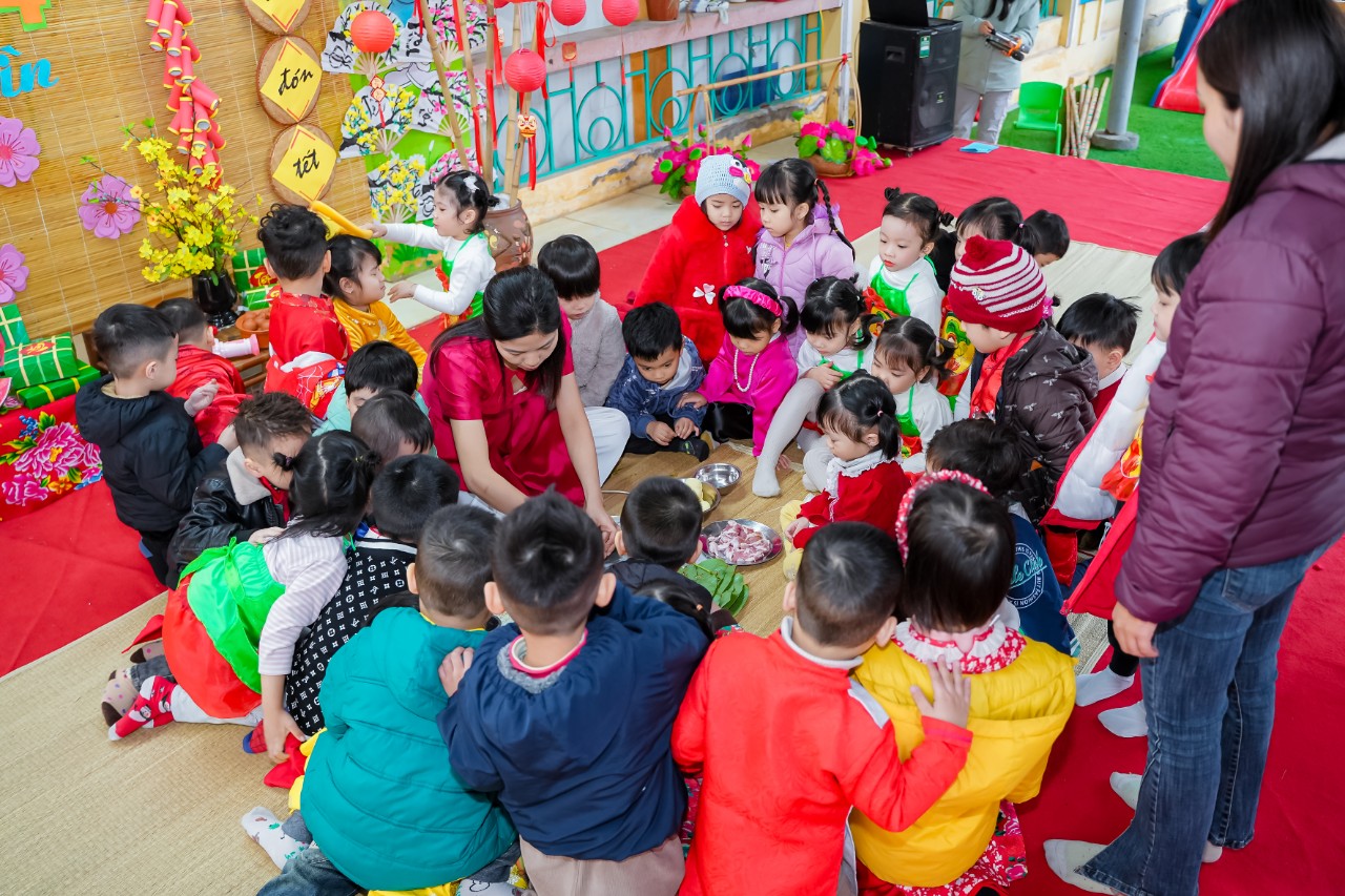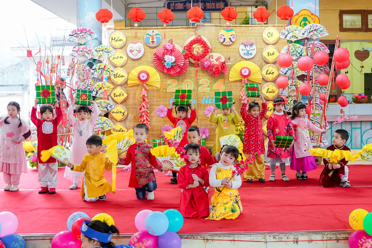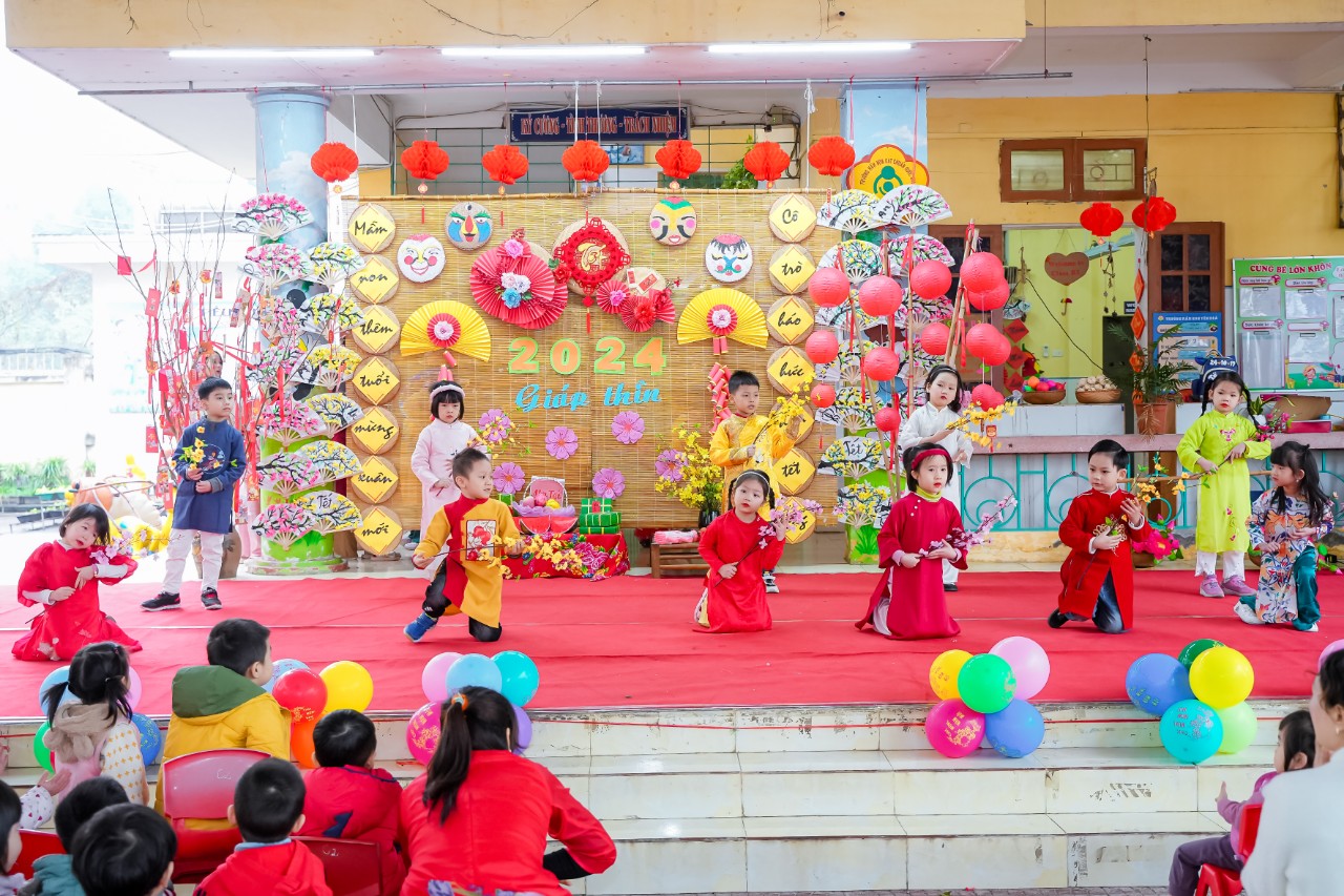 Vào những ngày cuối đông, chuẩn bị bước sang thềm năm mới không khí ở trường học những ngày này càng rộn ràng, phấn khích, Các cô giáo đã tổ chức cho bé và các bạn làm đẹp hơn không gian lớp học của mình như: Trang trí cây đào, cây mai, kết hoa, vẽ tranh, làm thiệp, làm những món quà nhỏ tặng người thân...Bé còn được được giao lưu với các bạn qua các bài hát có nội dung chủ đề Tết và mùa xuân. Thông qua hoạt động, các bé hiểu được ý nghĩa của ngày Tết cổ truyền dân tộc, thể hiện được cảm xúc và khả năng biểu diễn văn nghệ của mình.