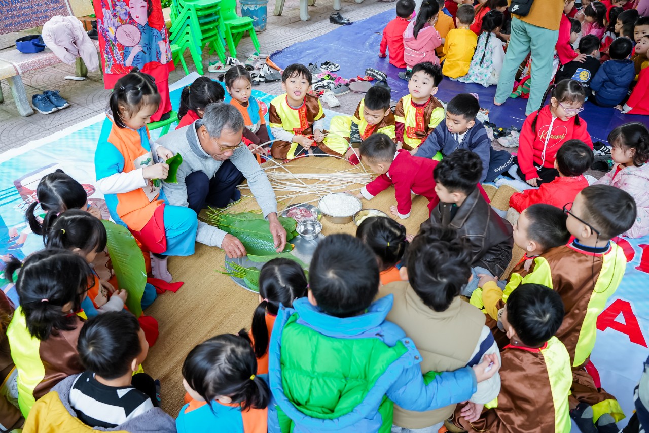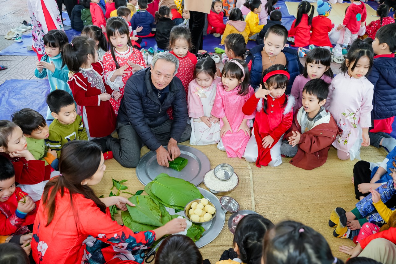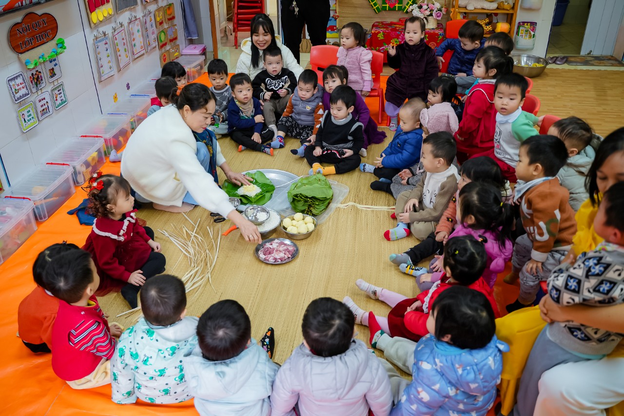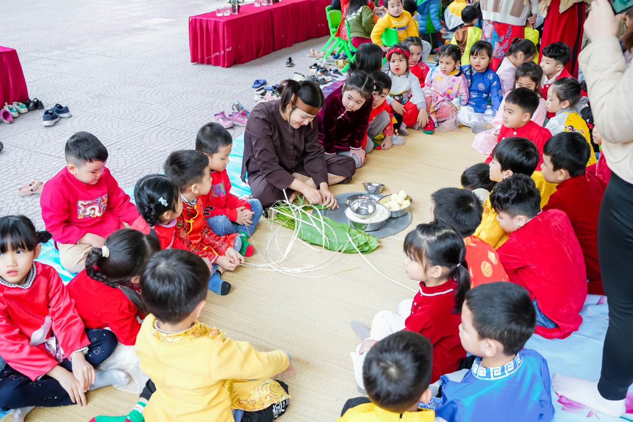Trong chương trình “ Xuân yêu thương’ các con còn được tham gia hoạt động trải nghiệm gói bánh chưng ngày tết nhằm giúp cho các bé tìm hiểu về phong tục, giáo dục nét đẹp văn hoá truyền thống của dân tộc Việt Nam, trẻ hiểu sâu sắc về ý nghĩa bánh chưng ngày tết và được cùng tham gia gói bánh cùng cô và các bạn.