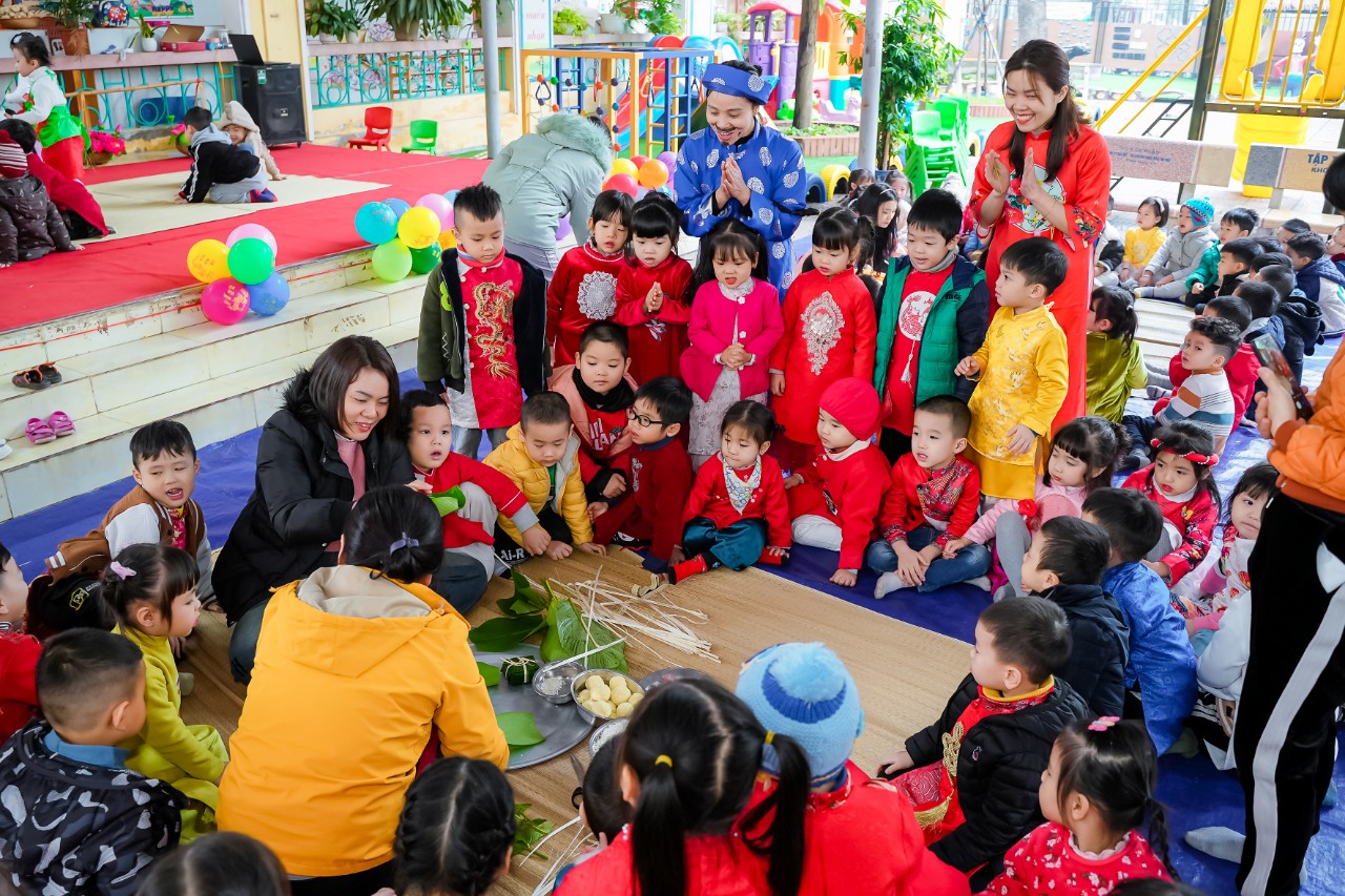 Các bé tỏ ra rất thích thú và hào hứng khi được tự tay làm một chiếc bánh chưng xanh. Một số bạn nhỏ rất khéo tay tạo ra những sản phẩm đầu tay. Qua đó các con sẽ hiểu thêm về ý nghĩa của những chiếc “Bánh chưng” và ý nghĩa về tình yêu dân tộc, sự gắn kết giữa con người với con người trong ngày Tết cổ truyền dân tộc. Đây cũng là món quà trải nghiệm thật ý nghĩa mà các cô dành tặng các con trước khi đón Tết Giáp Thìn 2024.