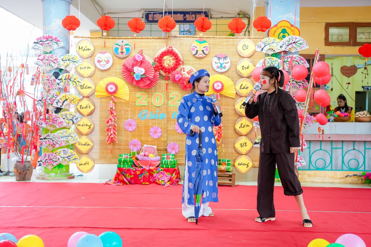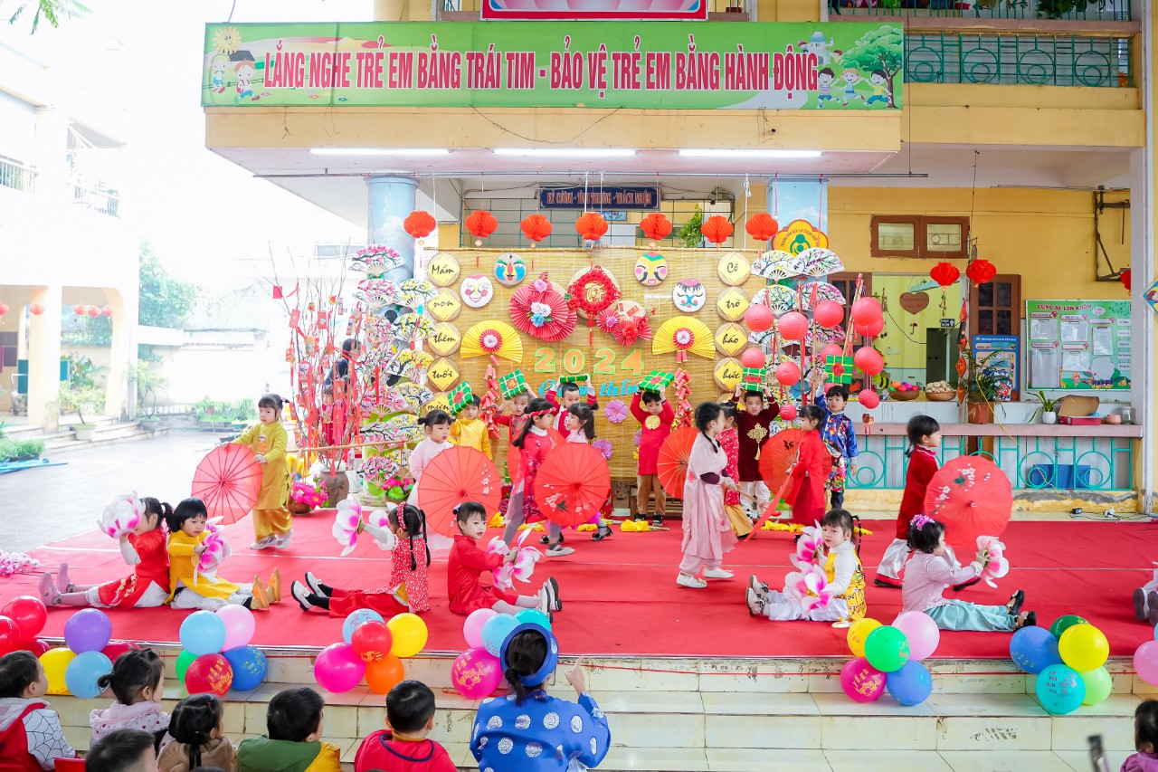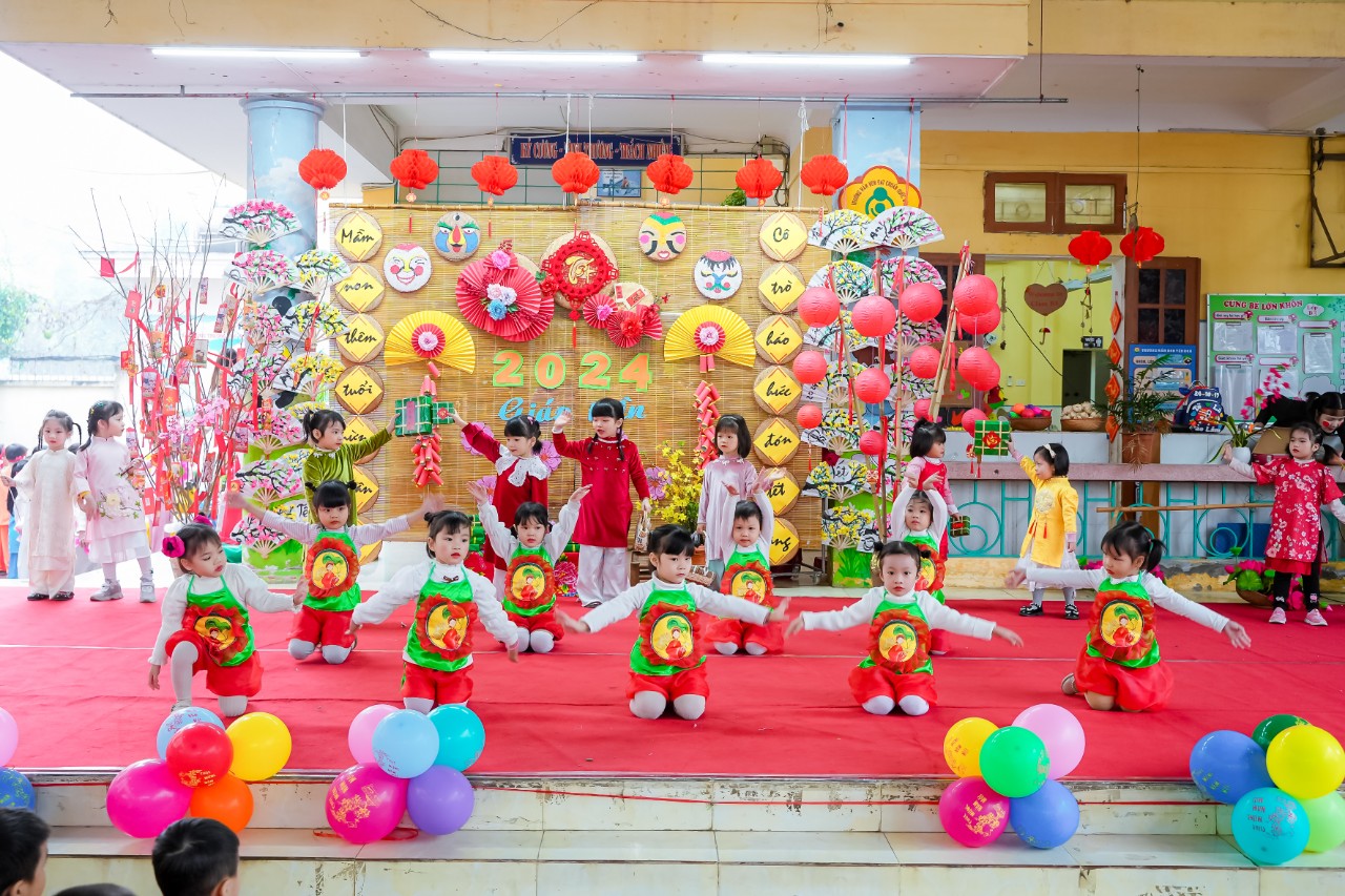Sân khấu thật rực rỡ, đáng yêu với những bộ trang phục khỏe khoắn làm cho không khí Tết của các bé càng trở lên tưng bừng, nhộn nhịp. Không gian lễ hội vui tươi, rộn rã với những tiết mục văn nghệ đặc sắc chủ đề mùa xuân do các bé biểu diễn.