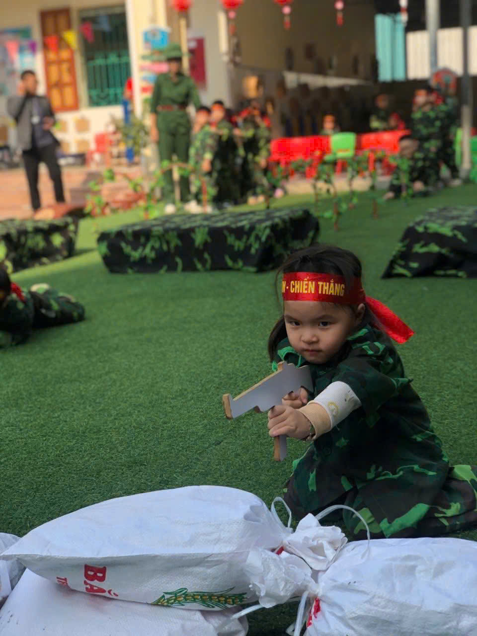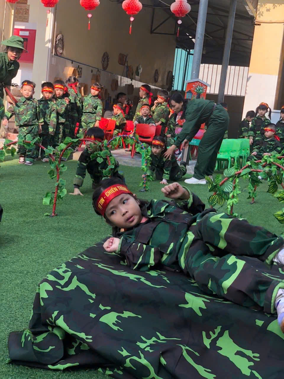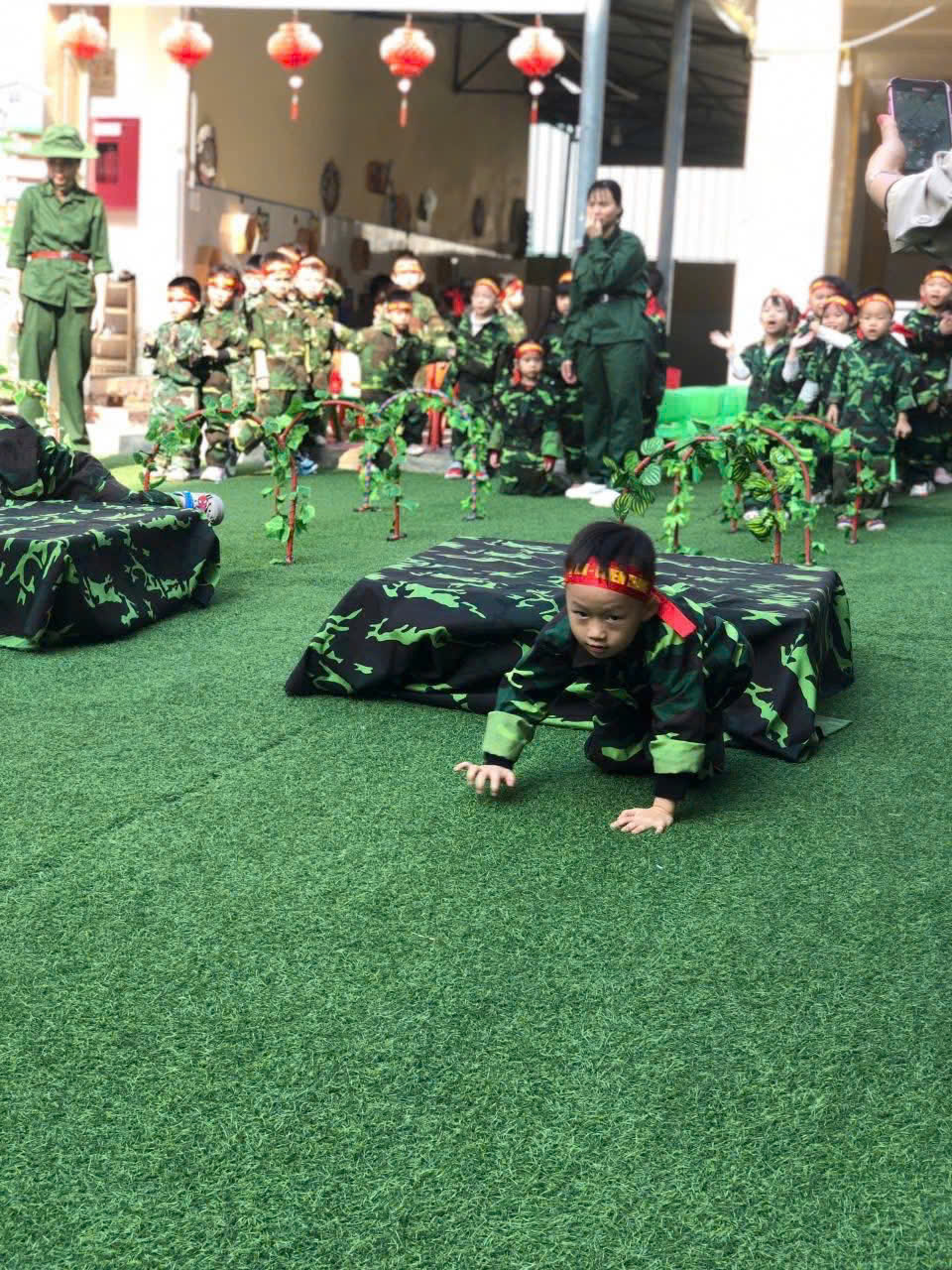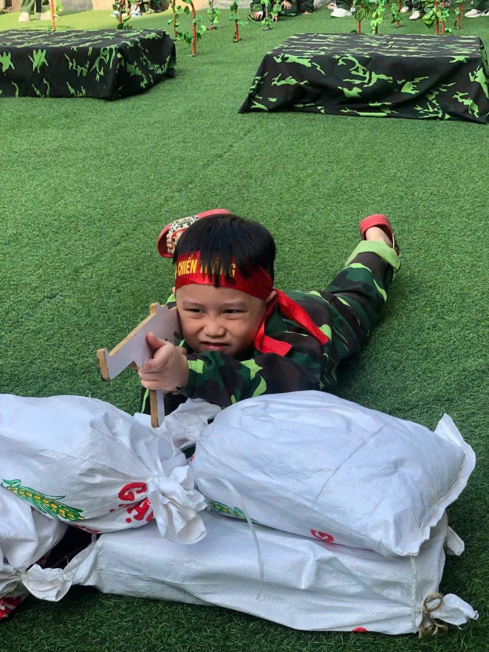 Điểm nhấn của chương trình là khu trải nghiệm “thao trường nhí” dành cho các bạn nhỏ khối MGN, MGB, NT với nhiều nội dung phong phú như bò thấp qua hầm, trườn qua vật cản, tập bắn súng mô phỏng, vận chuyển lương thực... Dưới sự hướng dẫn tận tình của các cô giáo, các em hào hứng tham gia, thể hiện sự dạn dĩ, tự tin và tinh thần vượt khó.Bên cạnh các hoạt động vận động, chương trình còn mang đến những trải nghiệm giàu ý nghĩa giáo dục. Các em được xem video clip giới thiệu về hình ảnh, hoạt động thường ngày của các chú bộ đội, từ công tác huấn luyện, sẵn sàng chiến đấu đến đời sống sinh hoạt giản dị nơi doanh trại.