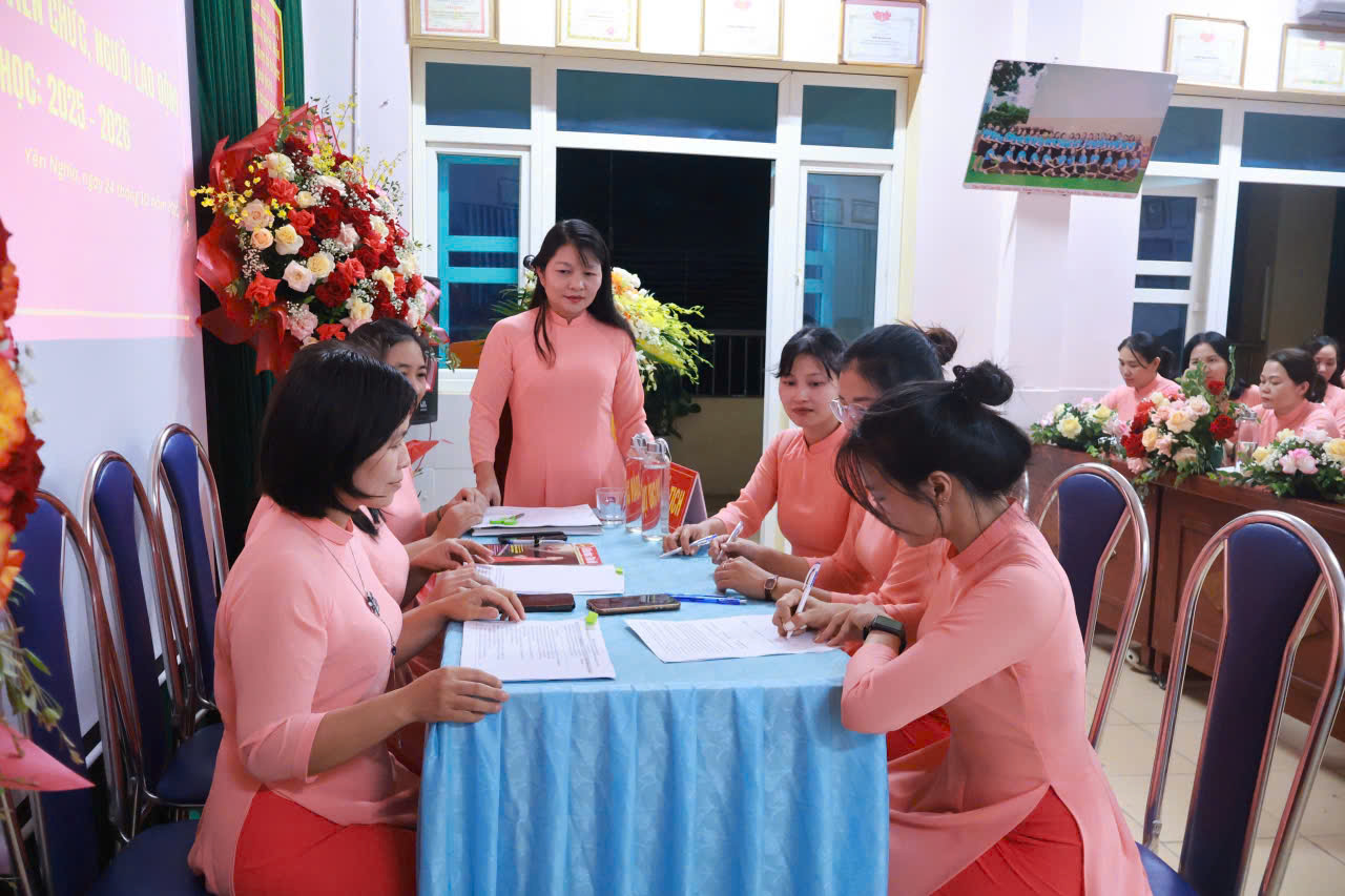 Đồng chí Trịnh Thị Doan- Chủ tịch công đoàn, PHT nhà trường thông qua Báo cáo kết quả công tác công đoàn Trường mầm non Yên Hòa năm học 2024 - 2025, phương hướng nhiệm vụ năm học 2025 - 2026. Phát động phong trào thi đua năm học 2025-2026 và kí giao ước thi đua của các bộ phận chuyên môn về việc thực hiện Nghị quyết Hội nghị CBCC, VC, NLĐ Trường mầm non Yên Hòa năm học 2025 - 2026.